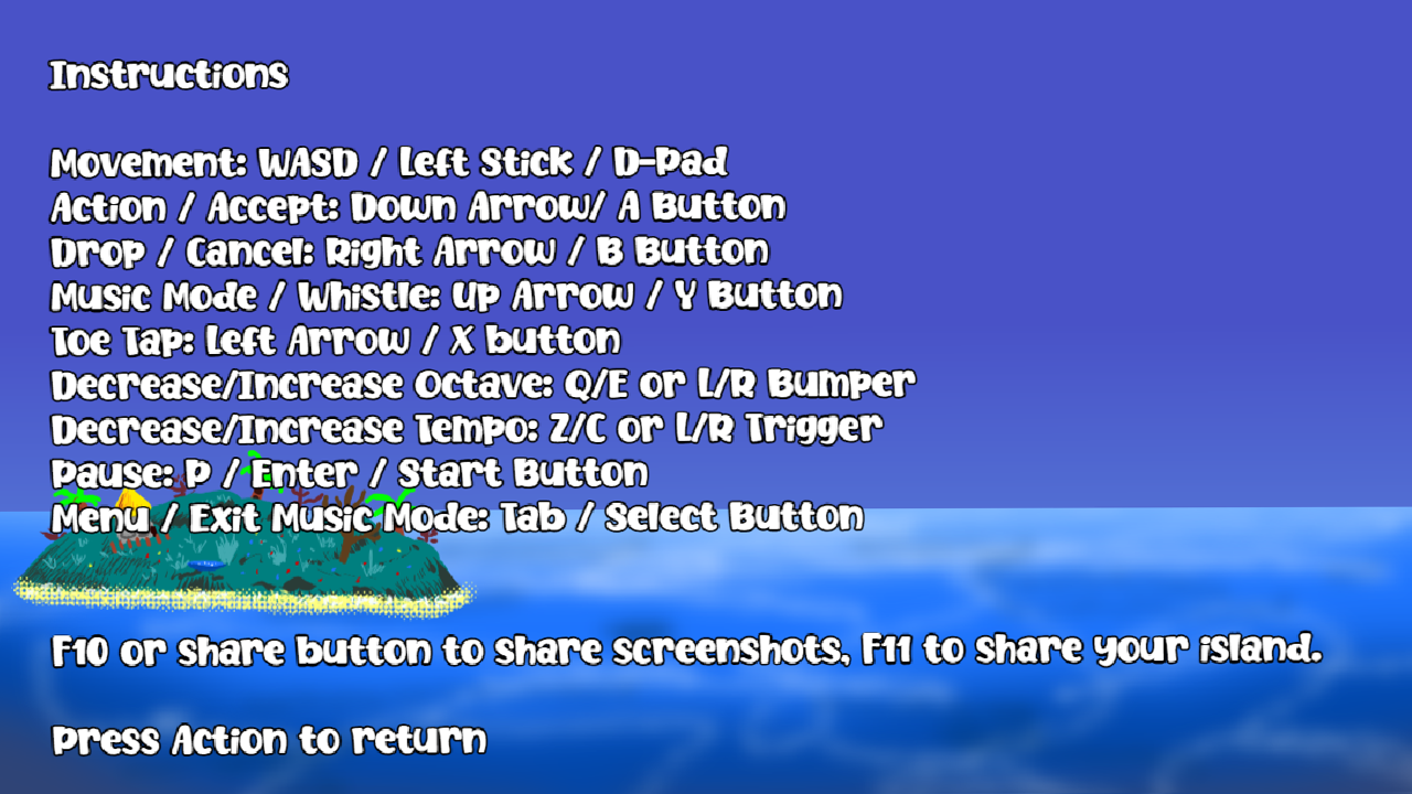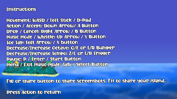 It's also over at Wavedash, and there are almost 40 achievements (!) you can get... but you can still get them outside Wavedash, don't worry! F10 shares screenshots, and F11 shares a snapshot of your island as-is so others can visit it and hear the masterpieces you've created! The only real difference between the itch version and the Wavedash version is that the Wavedash version might eventually get DLC!